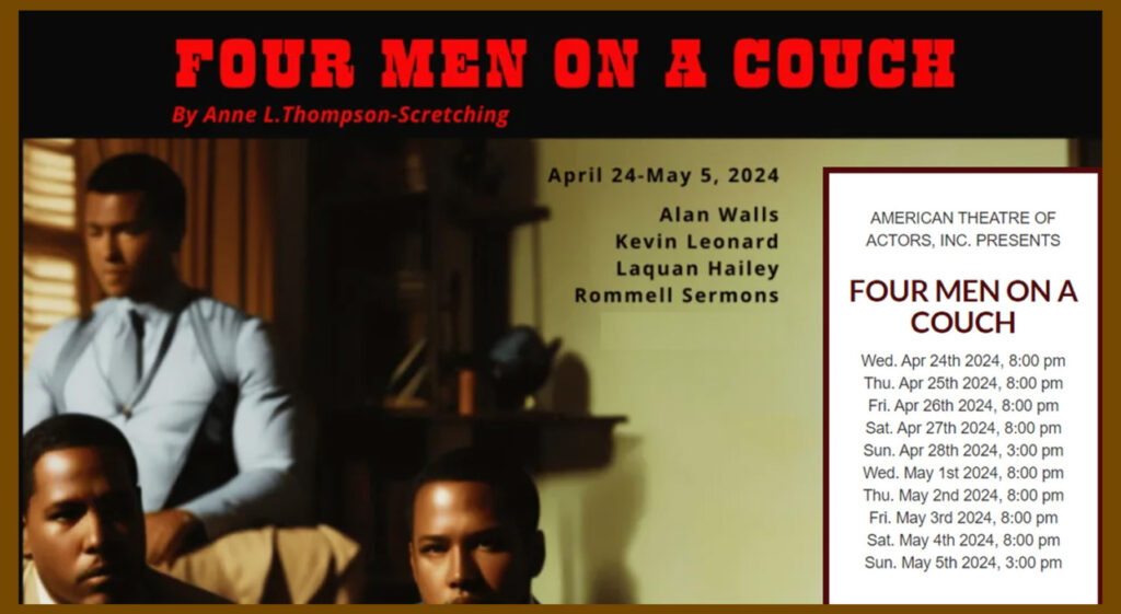 The 2004 Jean Dalrymple ‘Best Comedy’ award winning play FOUR MEN ON A COUCH, returns to American Theatre of Actors. Written by multi-award winning playwright Anne L. Thompson-Scretching whose many playwriting accolades include Audelco and Dalrymple Awards.